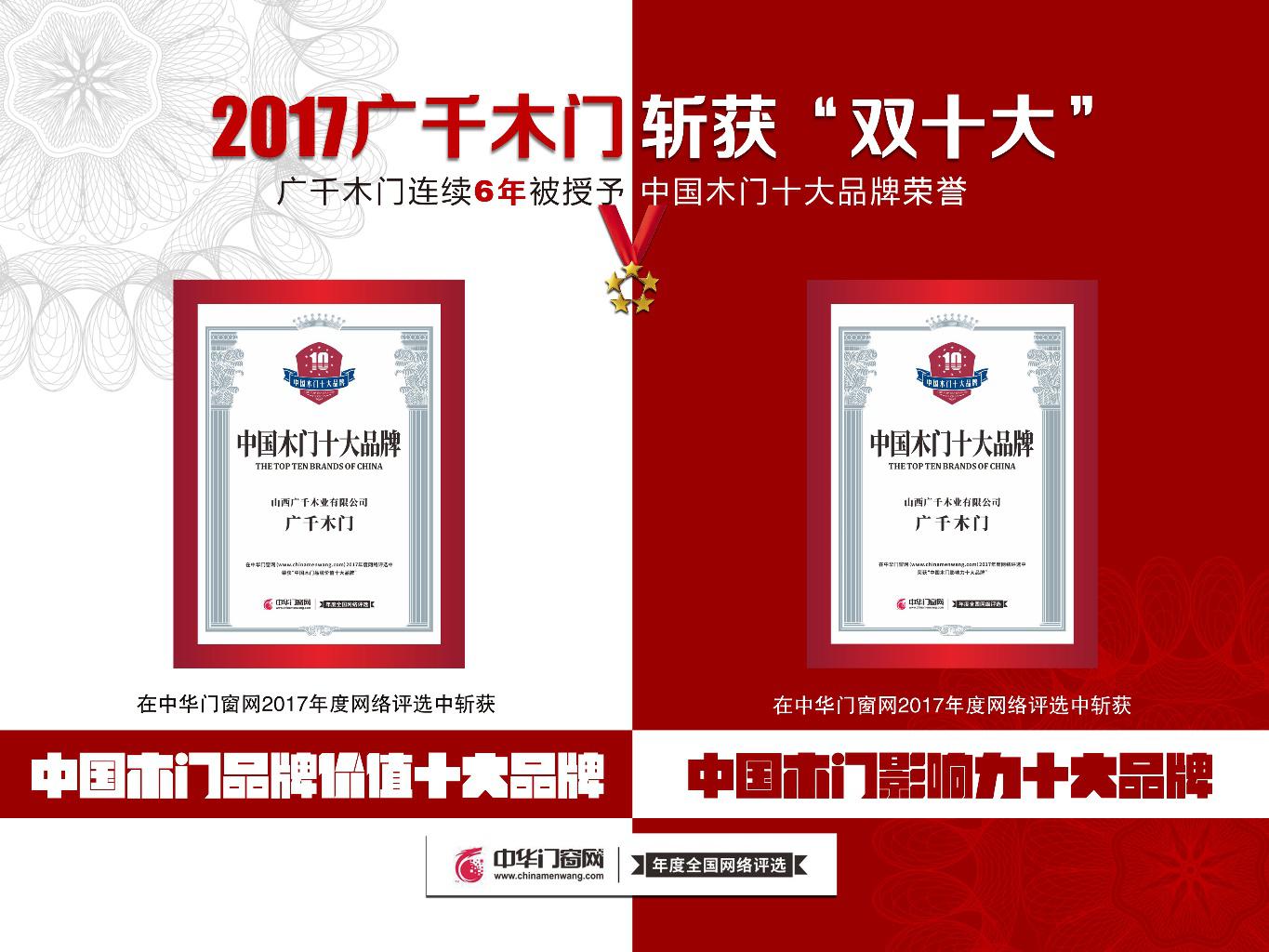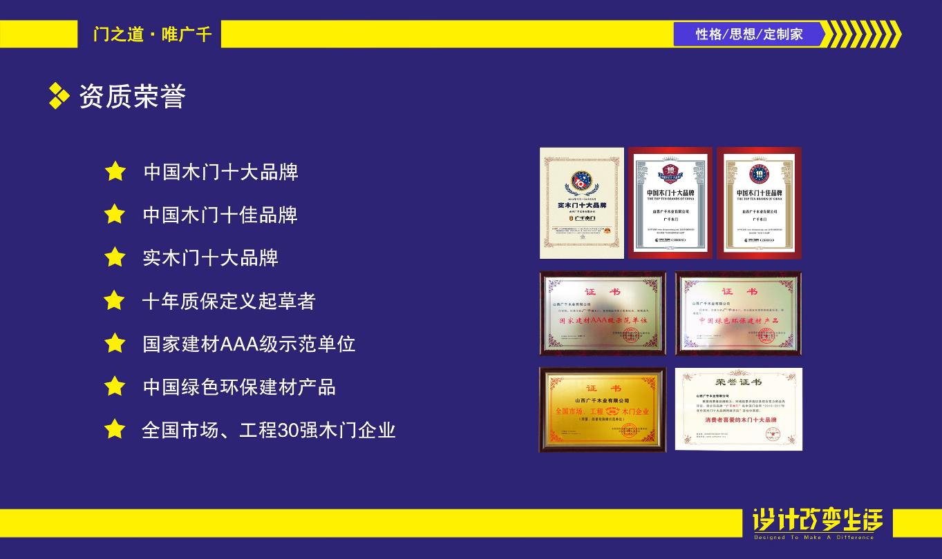 廣千,一個注重用戶體驗的品牌,以顧客為先的十大木門品牌,始終以“質量”、“誠信”為基礎,堅持走品牌發(fā)展的道路,憑借多年的業(yè)內(nèi)口碑積累、誠信的經(jīng)營之道、過硬的產(chǎn)品質量和覆蓋華北乃至全國的經(jīng)銷網(wǎng)絡,做到產(chǎn)品質量安全可靠,成為中國有價值和影響力的木門品牌之一。