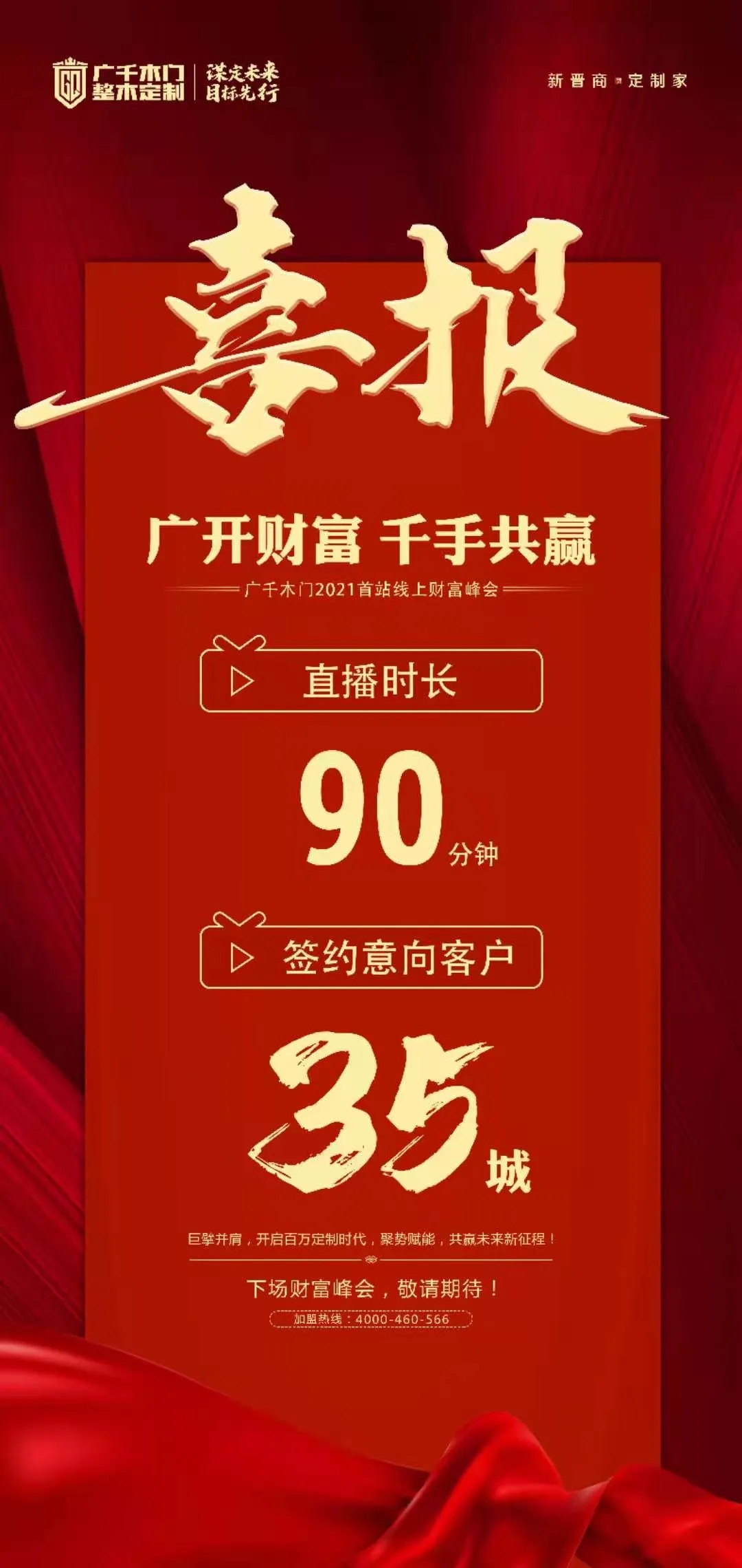 中國木門十大品牌廣千木門突破時(shí)間和地域招商的局限,以“云招商”的方式,與眾意向盟友隔空相遇,開啟2021年首場全國財(cái)富峰會,90分鐘的直播交流,鎖定意向代理城市35城的佳績,為這場線上財(cái)富峰會劃下完滿句號!