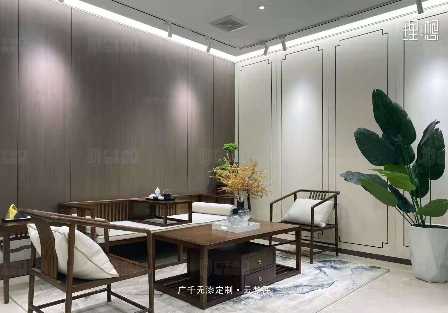 整體空間清晰素雅,開闊通透,浸透著東方特有的禪思靜謐。胡桃木色墻板與簡約新中式家具巧妙搭配,增添幾分藝術的從容,中式大宅的氛圍立現(xiàn)。