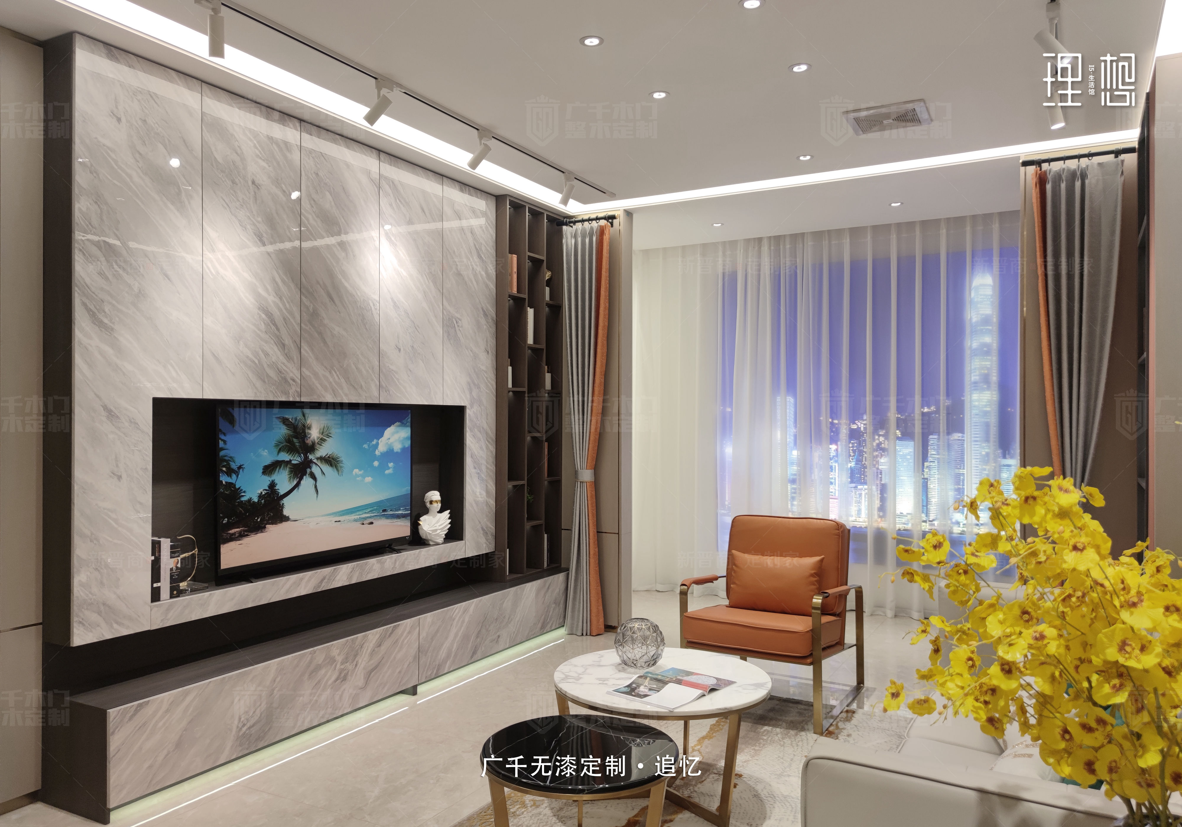 走入客廳,大面積高級灰背景,簡約而精致。愛馬仕橙皮椅作為點綴,為輕奢時尚,小資氣質(zhì)空間注入了大牌時尚色彩,輕松營造舒適溫馨的家居氛圍。