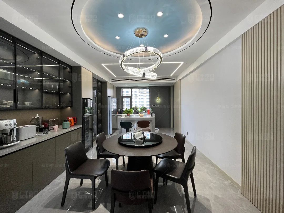 客廳與餐廳自然連貫,秩序井然,無(wú)形中增進(jìn)了區(qū)域間的交流互動(dòng)。極具夢(mèng)幻氣質(zhì)的吊燈也為用餐帶來(lái)了滿滿的儀式感,四處彌漫著靈動(dòng)的藝術(shù)氣息。簡(jiǎn)約格柵背景墻與深灰色餐邊柜的搭配,使整個(gè)空間充滿張力,營(yíng)造出舒適愜意的用餐氛圍。