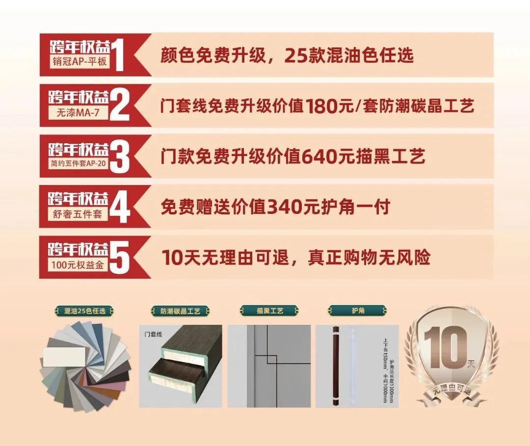 多元選擇,總有一款適合您!廣千木門(mén)整木定制,用心守護(hù)您的美好生活!活動(dòng)期間,進(jìn)店購(gòu)買(mǎi)以下任一產(chǎn)品,就能參與跨年單所有優(yōu)惠福利!一年只此一次,快來(lái)選購(gòu)吧!