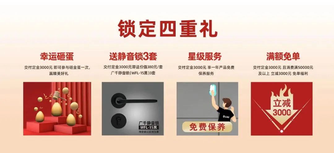 近月以來,由于各地大規(guī)模的封控,部分城市幾近停擺。隨著國家疫情防控政策的調(diào)整,為讓更多消費(fèi)者能享受到跨年福利,中國木門十大品牌廣千木門總部特決定跨年活動(dòng)福利延期!凡在2022年12月31日前下定的新老顧客,均可享受“四重豪禮、五大權(quán)益”,年前確定,開年配齊!接下來,千千帶您復(fù)盤優(yōu)惠,一省到底!