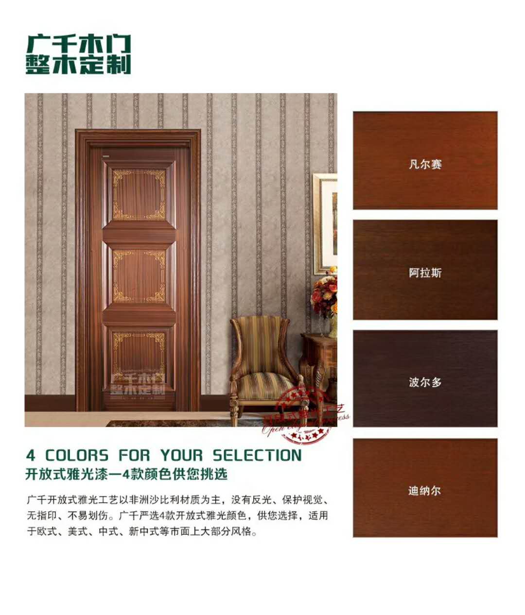 以非洲沙比利材質(zhì)為主,沒(méi)有反光、保護(hù)視覺(jué)、無(wú)指印、不易劃傷。廣千嚴(yán)選4款開(kāi)放式雅光顏色,供您選擇,適用于歐式、美式、中式、新中式等市面上的大部分風(fēng)格。