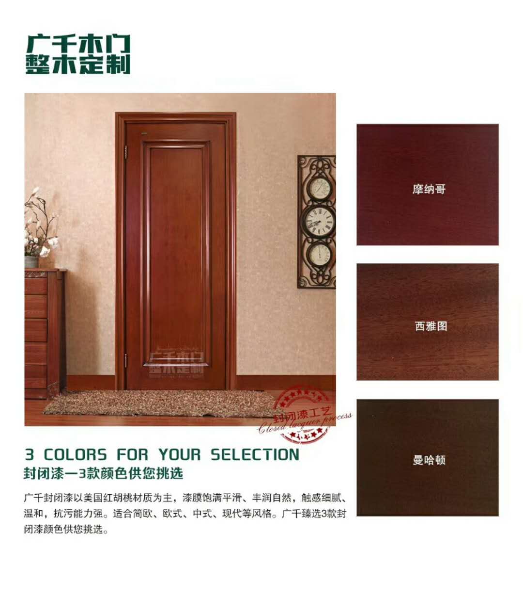 以美國(guó)紅胡桃材質(zhì)為主,漆膜飽滿(mǎn)平滑、豐潤(rùn)自然,觸感細(xì)膩、溫和,抗污能力強(qiáng)。適合簡(jiǎn)歐、歐式、中式、現(xiàn)代等風(fēng)格。廣千臻選3款封閉漆顏色供您挑選。