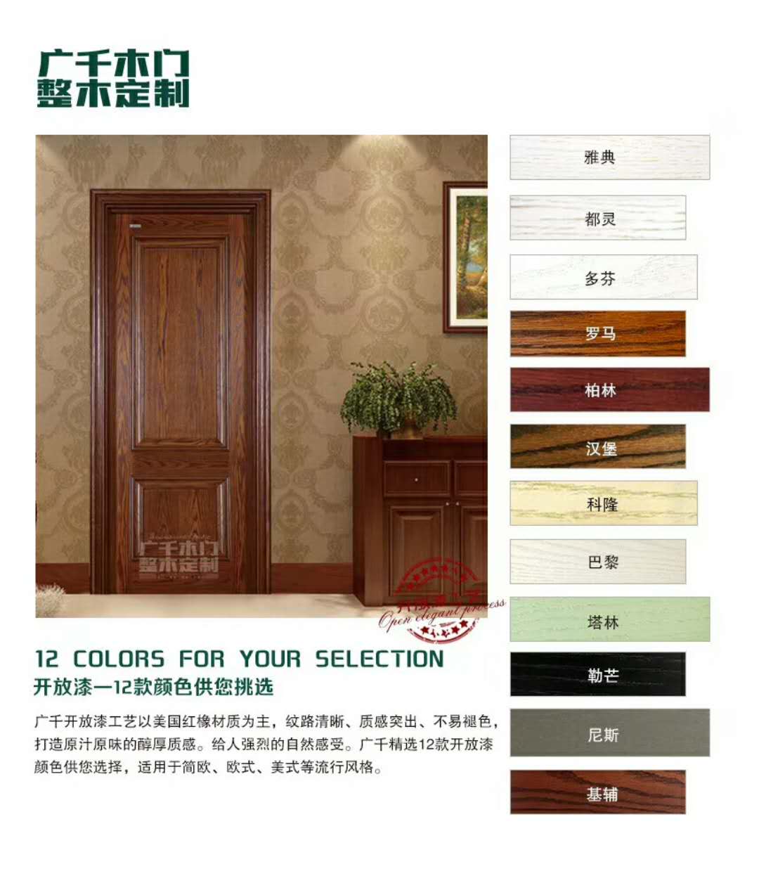 以美國(guó)紅橡材質(zhì)為主,紋路清晰、質(zhì)感突出、不易褪色,打造原汁原味的醇厚質(zhì)感。給人強(qiáng)烈的自然感受。廣千精選12款開(kāi)放漆顏色供您選擇,適用于簡(jiǎn)歐、歐式、美式等流行風(fēng)格。