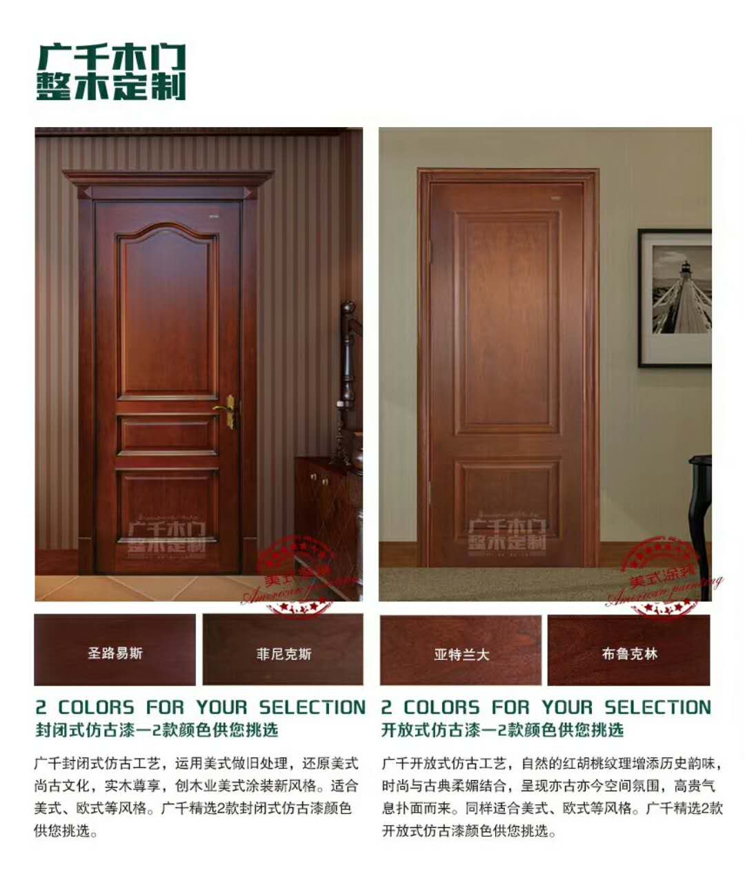 1、封閉式仿古:運(yùn)用美式做舊處理,還原美式尚古文化,實(shí)木尊享,創(chuàng)木業(yè)美式涂裝新風(fēng)格。適合美式、歐式等風(fēng)格。廣千精選2款封閉式仿古漆顏色供您挑選。