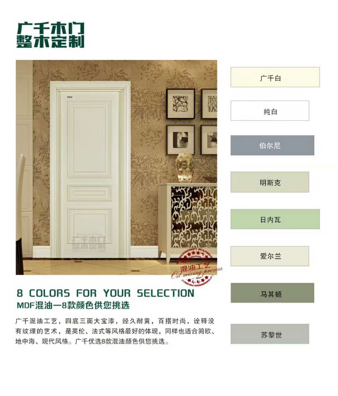 四底三面大寶漆,經(jīng)久耐黃,百搭時(shí)尚,詮釋沒(méi)有紋理的藝術(shù),是英倫、法式等風(fēng)格最好的體現(xiàn),同樣也適合簡(jiǎn)歐、地中海、現(xiàn)代風(fēng)格。廣千優(yōu)選8款混油顏色供您挑選。
