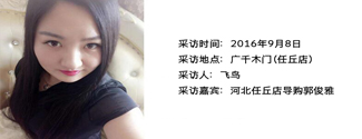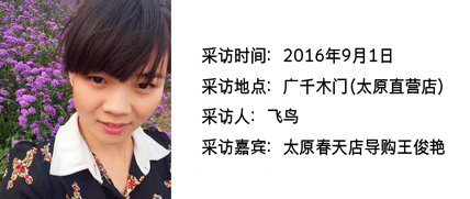 采訪時(shí)間:2016年9月8日;采訪地點(diǎn):廣千木門(任丘店);采訪人 :飛鳥(niǎo);采訪嘉賓:河北任丘店導(dǎo)購(gòu)郭俊雅。...