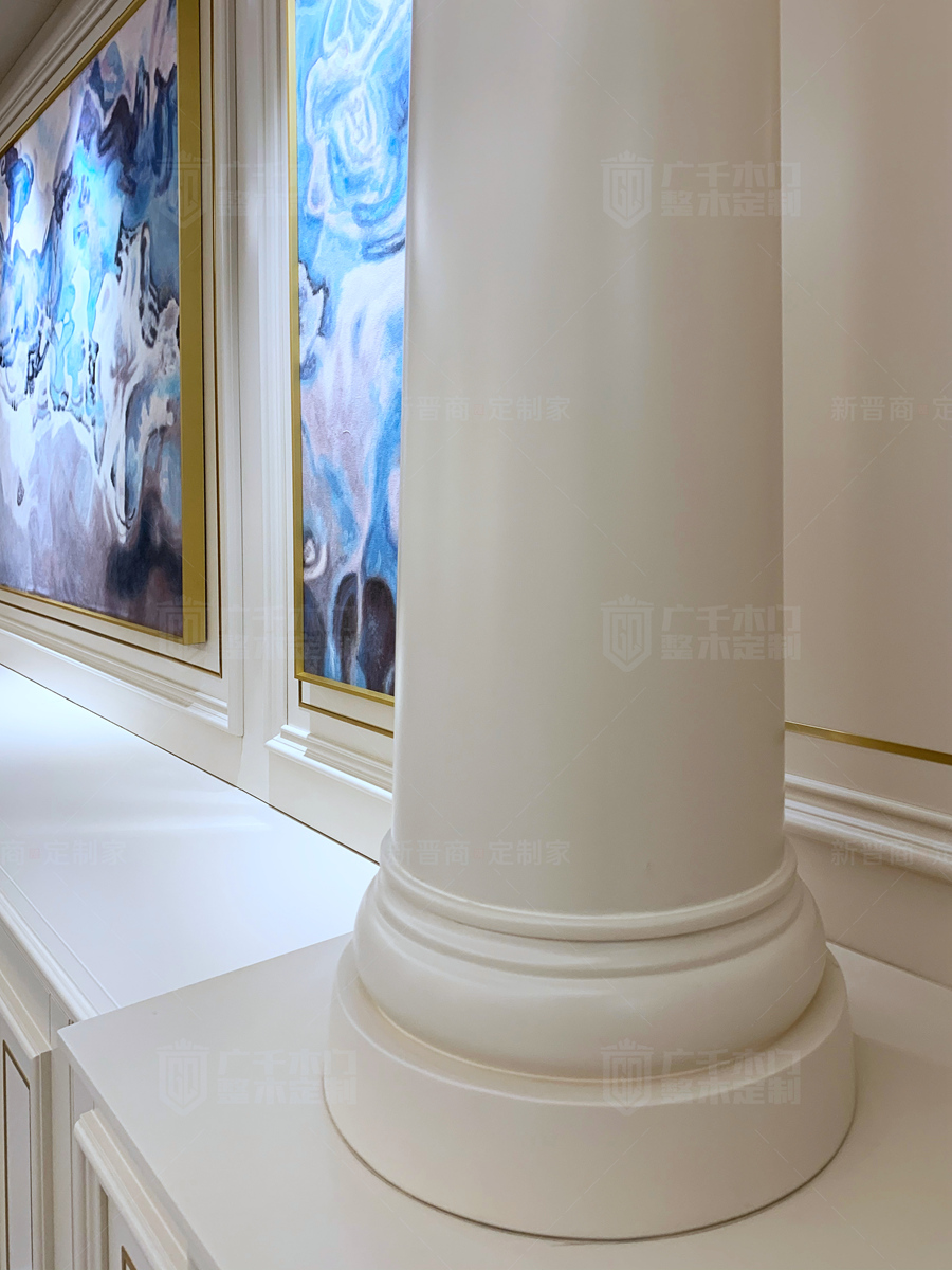 主色選用廣千愛爾蘭白,妙用金屬飾條闡述時代文化,讓人仿佛穿行在藝術故事的長廊,探尋傳承木作之美。羅馬柱與壁爐無疑是歐式風格最具歷史流韻的風物標志。