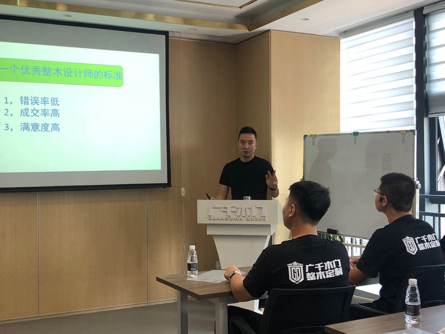 以產(chǎn)品為基石,設計為導向。中國木門十大品牌廣千木門整木定制在為期3天的培訓課堂中,三位老師分別從“設計師標準16步、整木定制測量注意事項、室內(nèi)風水應用、廣千素材庫講解、標準圖紙規(guī)范、CAD方案設計、酷家樂終端設計”等方面為每一位設計師營造了生動形象的課堂氛圍。設計總監(jiān)申總在此次培訓中強調(diào)“好設計,就是好銷售”,要通過一系列系統(tǒng)的培訓學習,在設計師拔高下提高門店服務質(zhì)量,提升服務水平,為顧客打造完美“定制家”。