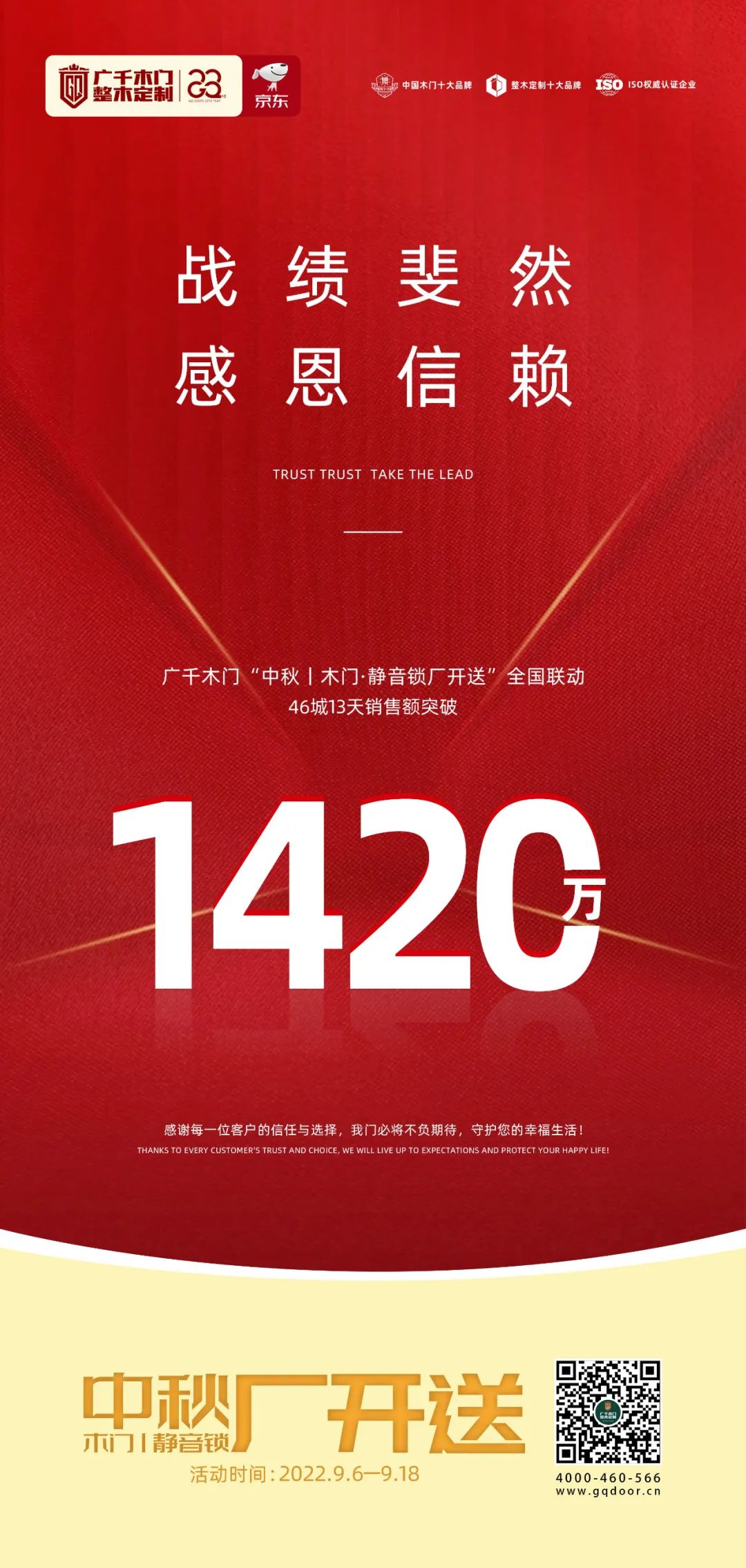 金秋九月,丹桂飄香。2022年9月18日,中國木門十大品牌廣千木門整木定制“中秋木門、靜音鎖廠開送”全國聯(lián)動超燃告捷,46城13天銷售額突破1420萬!如此耀眼的成績,為每一位堅定整木定制事業(yè)的廣千人注入了極強的自信!