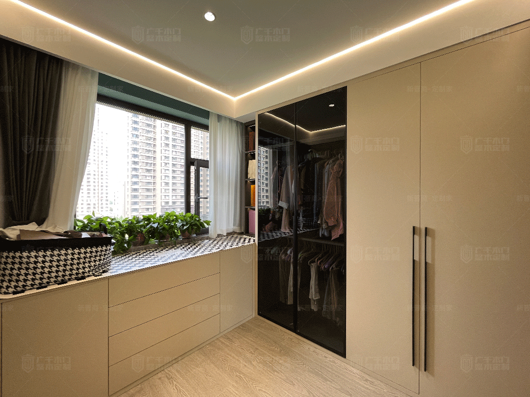 目之所及,美好所至。整個(gè)衣帽間以愛(ài)爾蘭白搭配明斯克灰,于不動(dòng)聲色中裝點(diǎn)出精致與優(yōu)雅。玻璃柜門(mén)與木作柜門(mén)的融合,構(gòu)造出層次分明的換裝空間。開(kāi)放式柜門(mén)的設(shè)計(jì),讓放置于其中的物品一目了然。在淡雅燈光的加持下,摩登質(zhì)感悄然迸發(fā)。