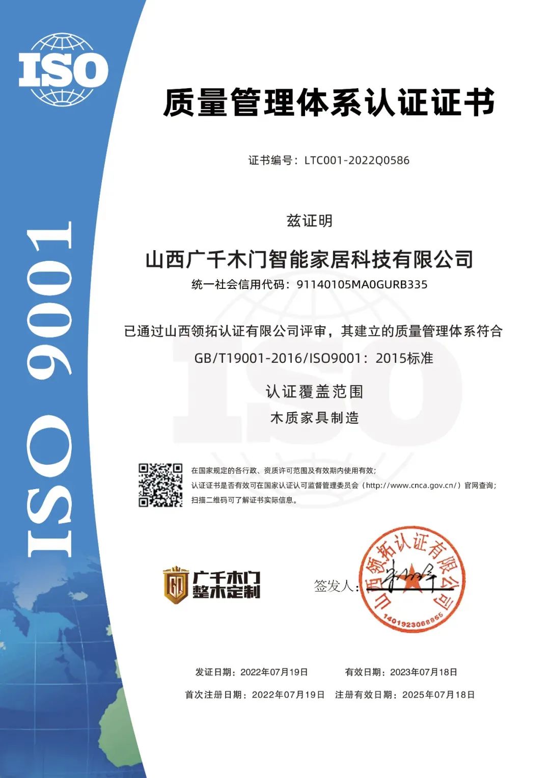 整木定制十大品牌廣千木門生產(chǎn)智造中心占地6萬余平米,不僅是山西環(huán)保生產(chǎn)示范單位之一,亦是一家通過了國(guó)家ISO質(zhì)量管理體系、環(huán)境管理體系、職業(yè)健康安全管理體系三重權(quán)威認(rèn)證的高標(biāo)準(zhǔn)木制品生產(chǎn)廠家。智能化、現(xiàn)代化的生產(chǎn)設(shè)備,專業(yè)性、創(chuàng)新性的研發(fā)人才,鑄就了廣千木門二十三年來的底蘊(yùn)與輝煌!