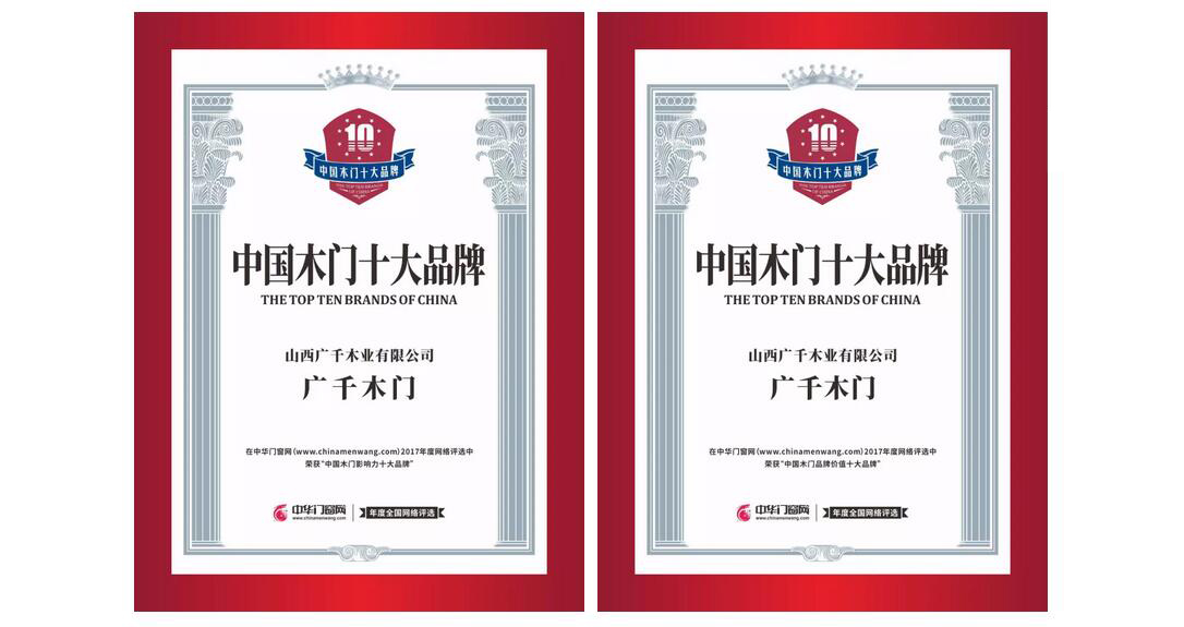 廣千木門(mén)斬獲“2017中國(guó)木門(mén)十大品牌”雙項(xiàng)大獎(jiǎng)