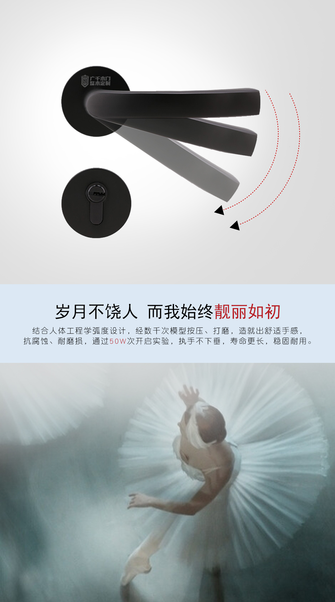 廣千木門結(jié)合人體工程學(xué)弧度設(shè)計,經(jīng)數(shù)千次模型按壓、打磨,造就舒適手感,抗腐蝕、耐磨損,通過50w次開啟實驗,執(zhí)手不下垂,壽命更長,穩(wěn)固耐用。